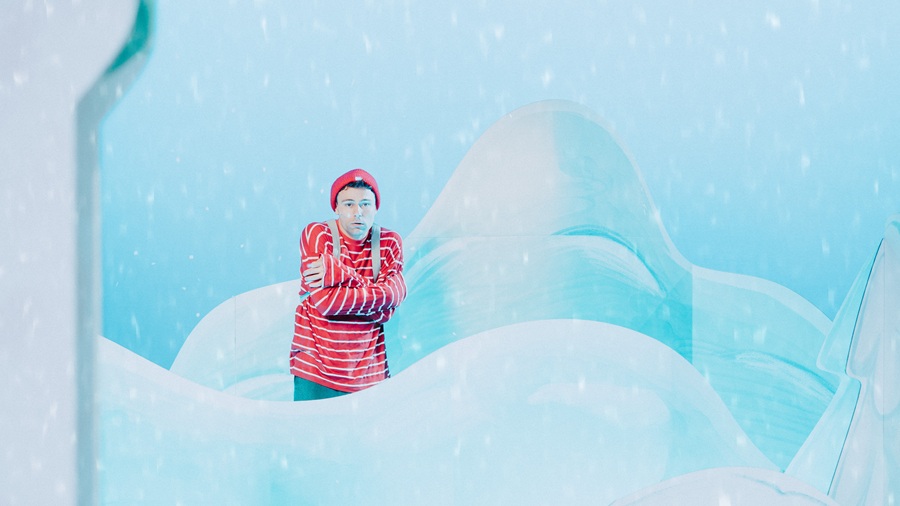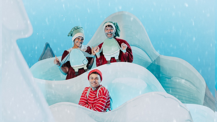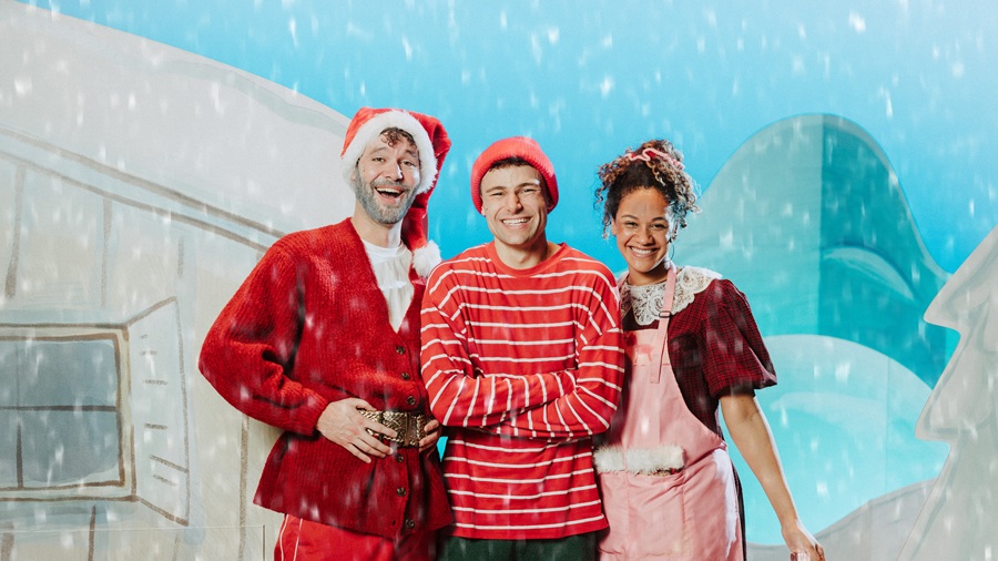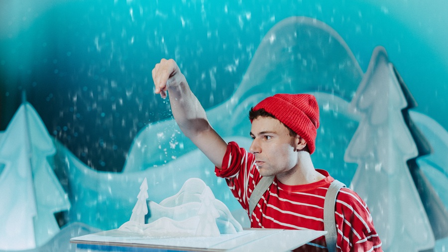Bij het betreden van de zaal liggen allerlei decorstukken plat op het podium. Wel is een scherm zichtbaar. Het is aan de cast om het decor op te bouwen. Twee platte bomen worden in elkaar geschoven en vormen zo één witte boom. Misschien heeft het meegekomen kind dit ook al in de foyer gedaan met één van de kleurbouwplaten. Het huis blijkt opengeklapt te worden, en zo verschijnt het interieur, als ware het een pop-up prentenboek. Speels, en het wordt nog speelser als de moeder in het stuk een boom omhakt en als kerstboom in het huis plaatst. Door een halve slag te draaien is deze meteen rijkelijk versierd.