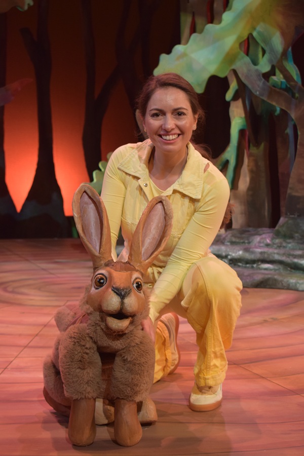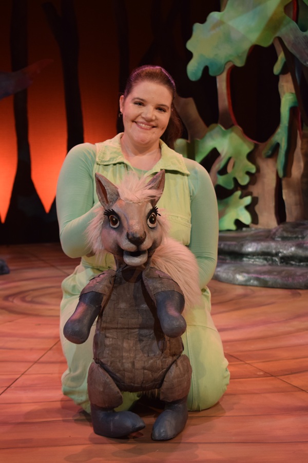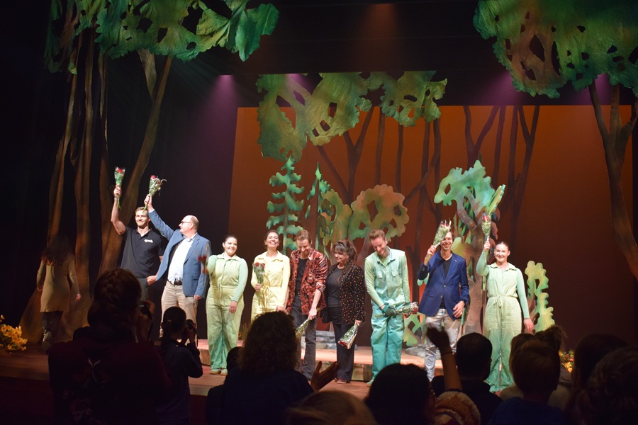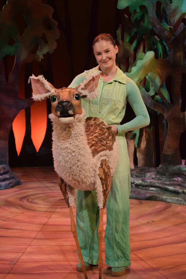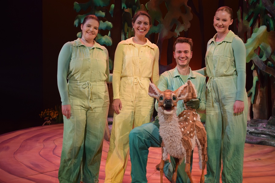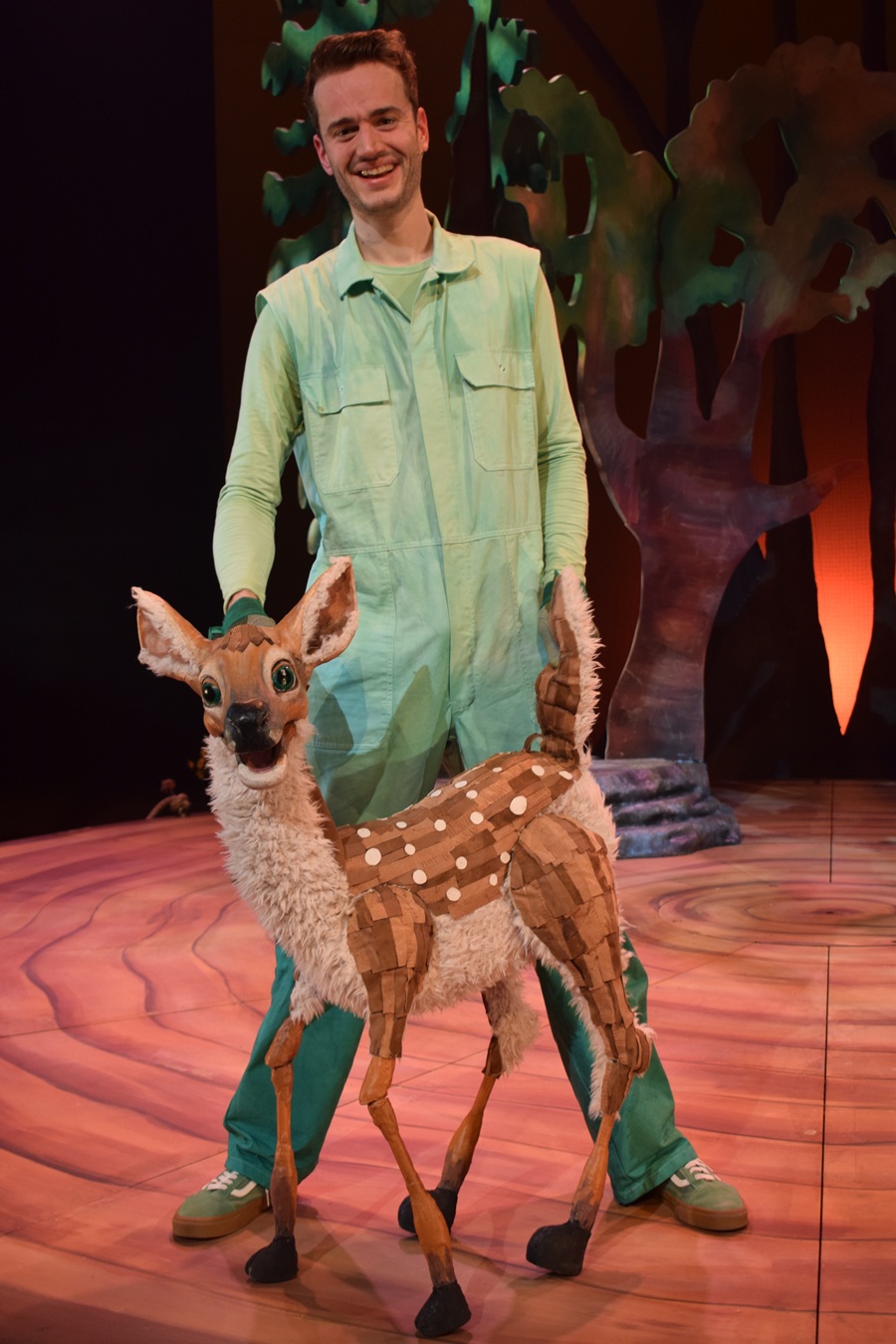 Dat weten we wel van Pepijn Schwartz, want hij is de hele voorstelling op als Bambi. Hij heeft in het verleden al meermaals getoond dat hij een meester is in het tot leven wekken van poppen (misschien is hem Chucky geven geen goed idee), en zijn Bambi is dus om bij weg te smelten, mede door het stemgebruik. Opvallend voor wie eerdere Theater Terra voorstellingen met poppen zag: de kostuums van de acteurs zijn niet zwart maar groen en geel, waardoor ze mooi in het decor passen (en ook makkelijker zelf ‘onzichtbaar’ zijn).