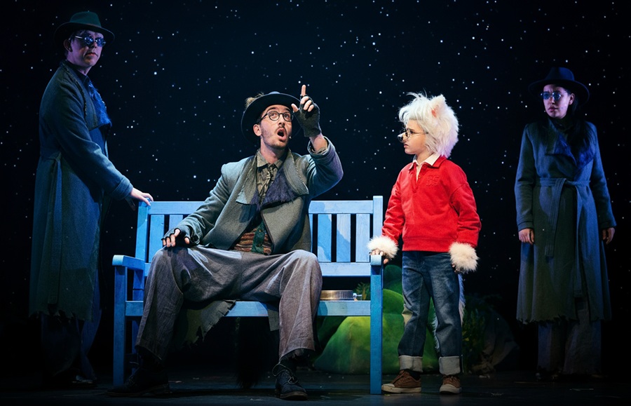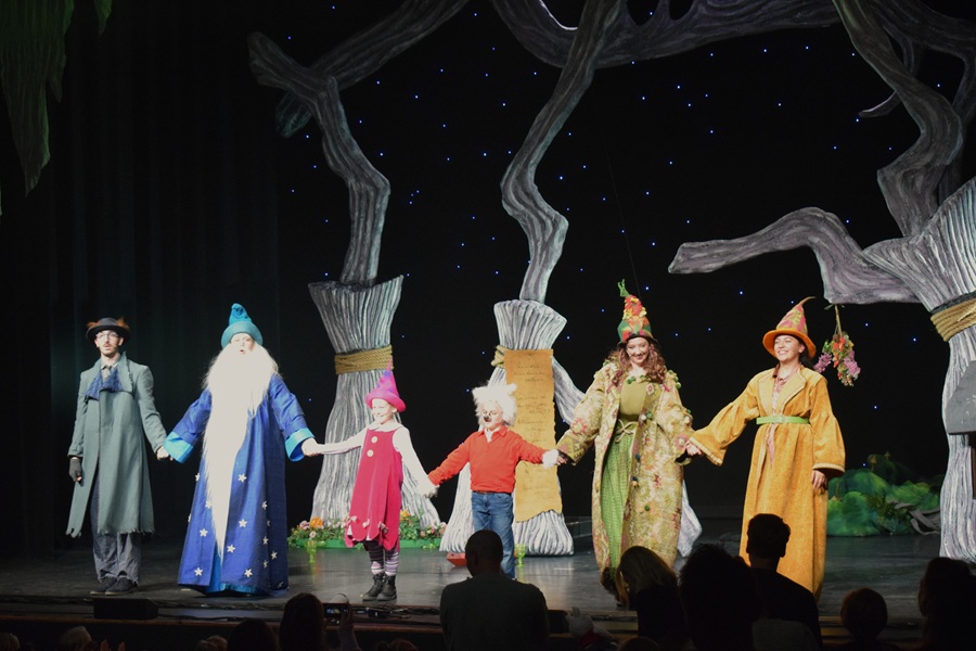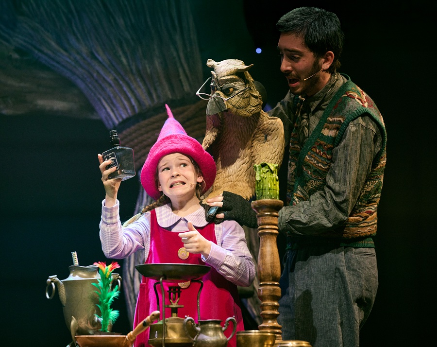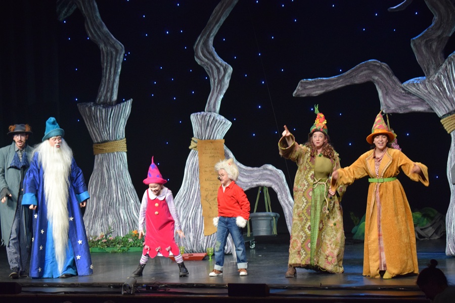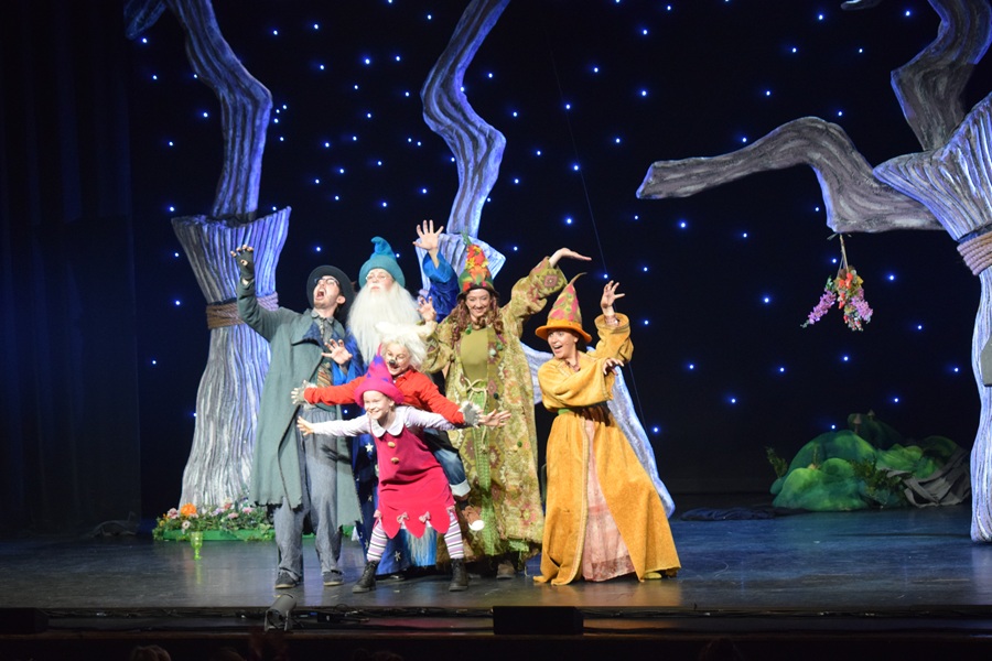 De cast bestaan uit vier volwassenen en twee kinderen. Die laatste spelen natuurlijk Dolfje en Foeksia. In deze tour zijn voor beide rollen vier kinderen. In Zeist waren dat Mila Ebbenhorst, die als ik een gesprek bij de merchandise-balie goed heb begrepen een thuiswedstrijd speelde en Damin Dijk als Dolfje. Geholpen door zijn kleine postuur maar voornamelijk door goed spel is Dolfje zeer aandoenlijk en schattig. Foeksia heeft duidelijk veel podium-présence. Bij Daan Karstens als opa Weerwolf moest ik onbewust aan Phineas en Ferb denken (“Zijn jullie niet een beetje jong om …”) maar hij zingt en speelt overtuigend, zeker als hij de rol van uil Pallas op zich neemt. Dat jonge geldt vast ook voor Sem Konijn, maar zijn baard (denk Dumbledore of Gandalf) verhult dat volledig. Hij vertolkt de rol prima. Grotesk spelen zal de opdracht zijn geweest voor beide heksen, en dat doen Els Damen (Minuul) en Balera Bagchus (Strega) met verve.