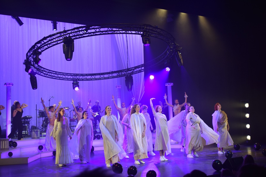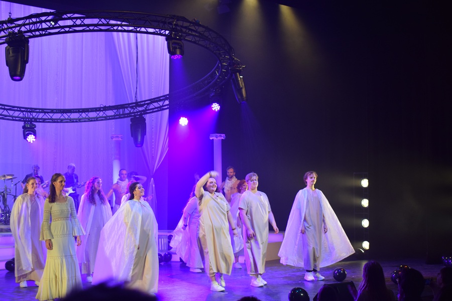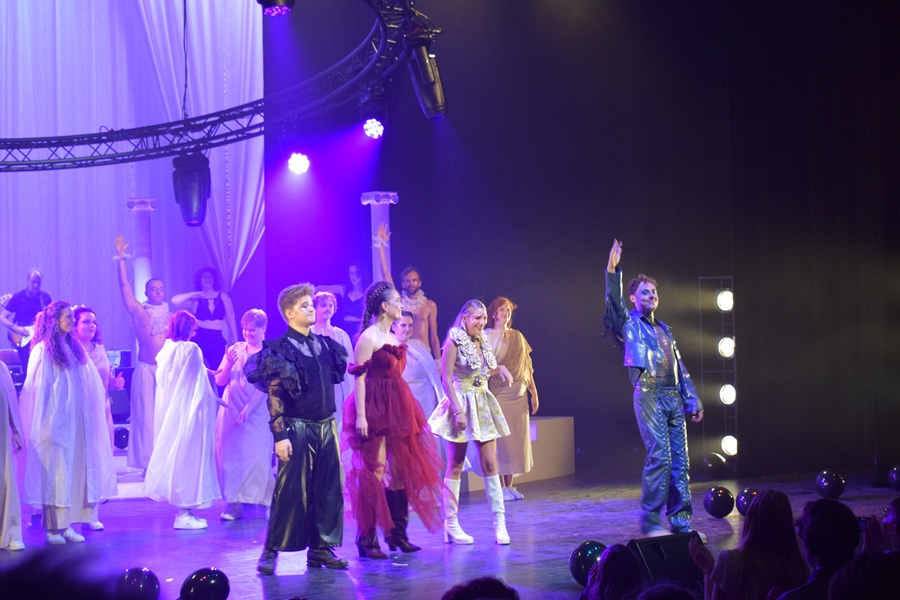 Muzikaal is dit namelijk een heerlijke voorstelling. Van de simpele gitaarklanken waarmee de voorstelling wordt geopend, tot het shownummer Dokter Dokter, van het stevige “dit is ons (strijd)lied” tot het jazzy “overal in mij ben jij, de songs zijn raak. Er is een band die waanzinnig speelt, en de cast, zowel solisten als het ensemble (koor), voert ze ook bijzonder sterk uit. Met Isabelle Draaijer (Zeus/Louie), Thijmen Tolido (Fons), Tessa de Vree (Dunya), Jasper Olde Dubbelink (Yorick) en Suzanne van Huizen (Siena) heeft de voorstelling een uitstekende hoofdcast, Voeg daar een prachtige staging aan toe, en fraaie effecten. De ballonnenregen aan het begin van de tweede akte is tof, en wat er met het frame met de lampen uiteindelijk gebeurt is spectaculair.