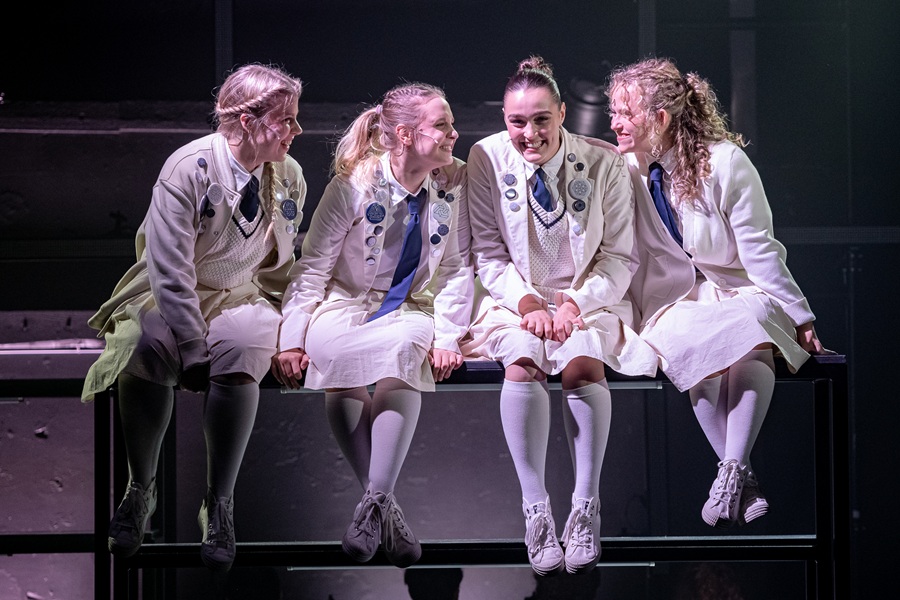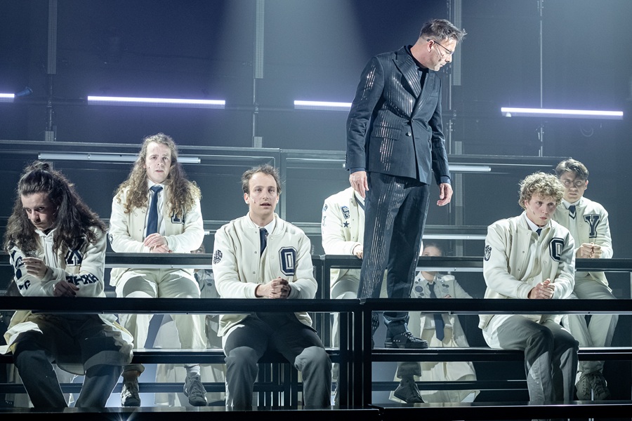 Er is een poging gedaan het stuk wat tijdlozer te maken. De kostuums, met jasjes die wat lijken op Amerikaanse highschool jassen, en daaronder juist weer een stropdas vallen vooral op door de verschillende rugtekeningen, die slaan op de rol in het stuk. Moritz heeft bijvoorbeeld een vlinder, Melchior een uil. Toch zijn met name de schoolscenes wel heel erg ‘100 jaar geleden’. De staging, waarbij de jongeren vrijwel continu op het podium staat, soms verscholen achter de tribune, met tamelijk veel wisselingen van setting, werkt goed. De tribune zelf is zeer effectief, al voelt het moment dat de knaller “t Is een kloteleven (the bitch of living)” wordt gezongen, dit nog niet met volledige overgave gebeurt door de getrapte ondergrond. Energie die we wel te zien krijgen en voelen bij die andere explosie, ‘Fuck it Gefucked’(Totally f*cked). Ronduit griezelig (op een circusacrobaten manier) voelt het als we Moritz (zonder borg) op de bovenste trede zien staan.